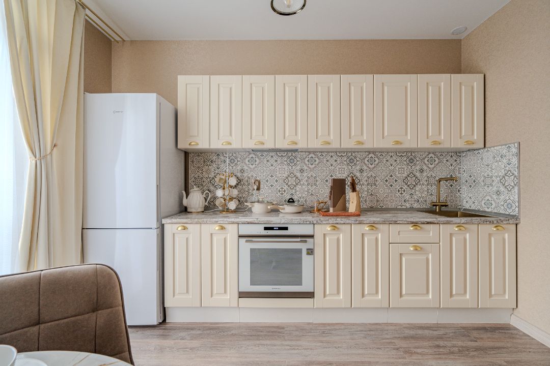 Укомплектованная кухня со всем необходимым (холодильник, индукционная плита, чайник, духовой шкаф, а также посуда, приборы);